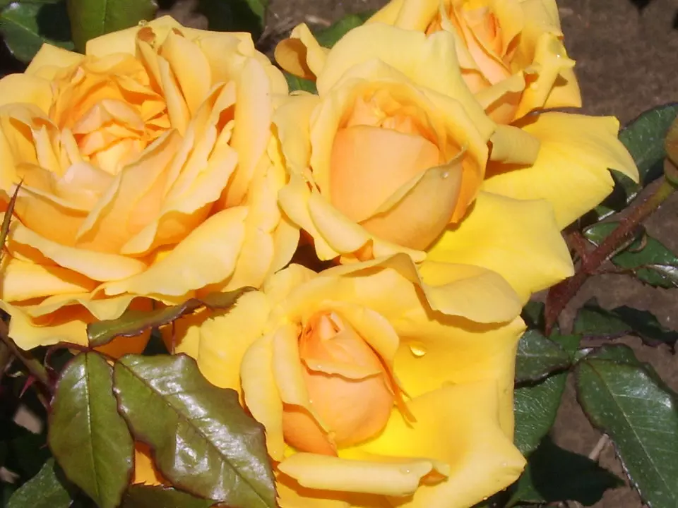 A floribunda rose with fully double golden yellow clusters a midst a rich green foliage and a lovely sweet scent.