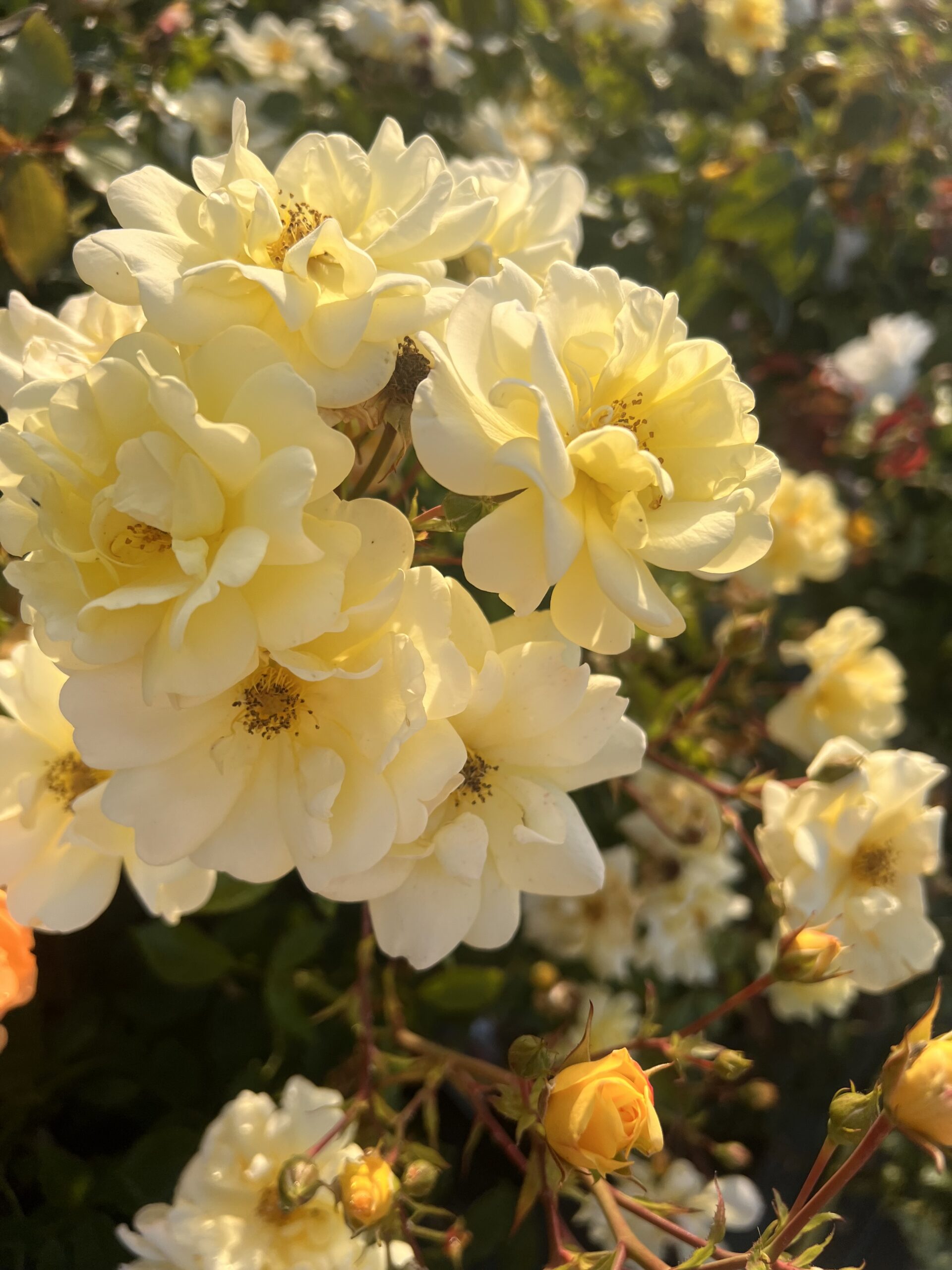A floribunda rose with yellow blooms with a moderate fragrance. They repeat flower through the season June through September. ‘Honey Bee Mine’ is healthy with good disease resistance and hardiness. They flower throughout the summer.