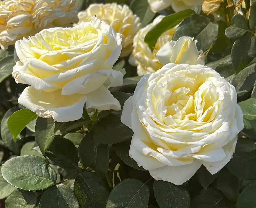 Lovely ivory to white petal packed blooms making a nice ruffled form. The blooms are produced in clusters in a midst of healthy rich green foliage with a sweet scent. This variety tends to be very healthy and repeat flowers from early summer. The rose is named in celebration of the royal marriage of the Crown Princess Mary to Frederik, Crown Prince of Denmark.