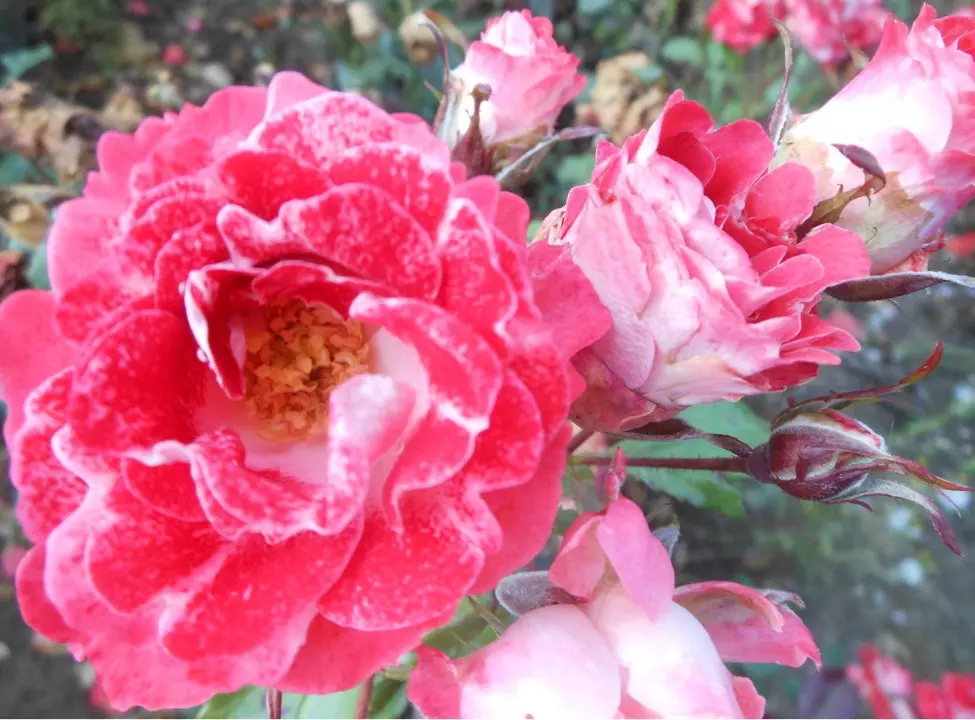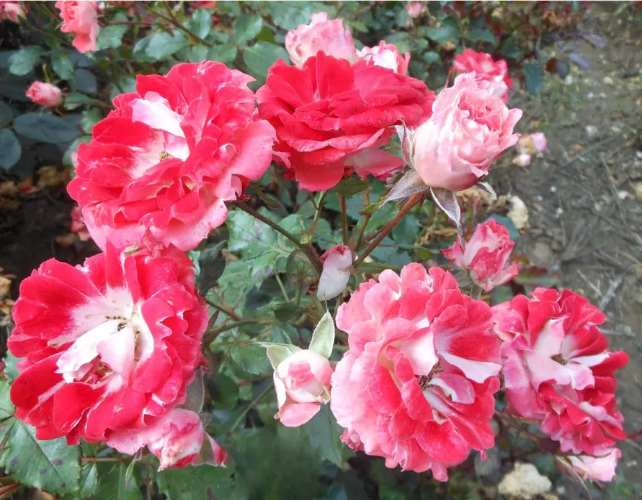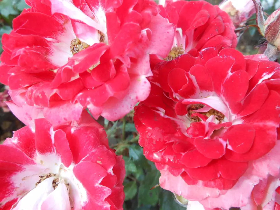 An array of cherry red flowers with a silvery white reverse with patches of white in the petals. The rose carries a lovely gentle scent and healthy dark glossy green foliage. The variety is hardy with continuous flowering throughout the season.