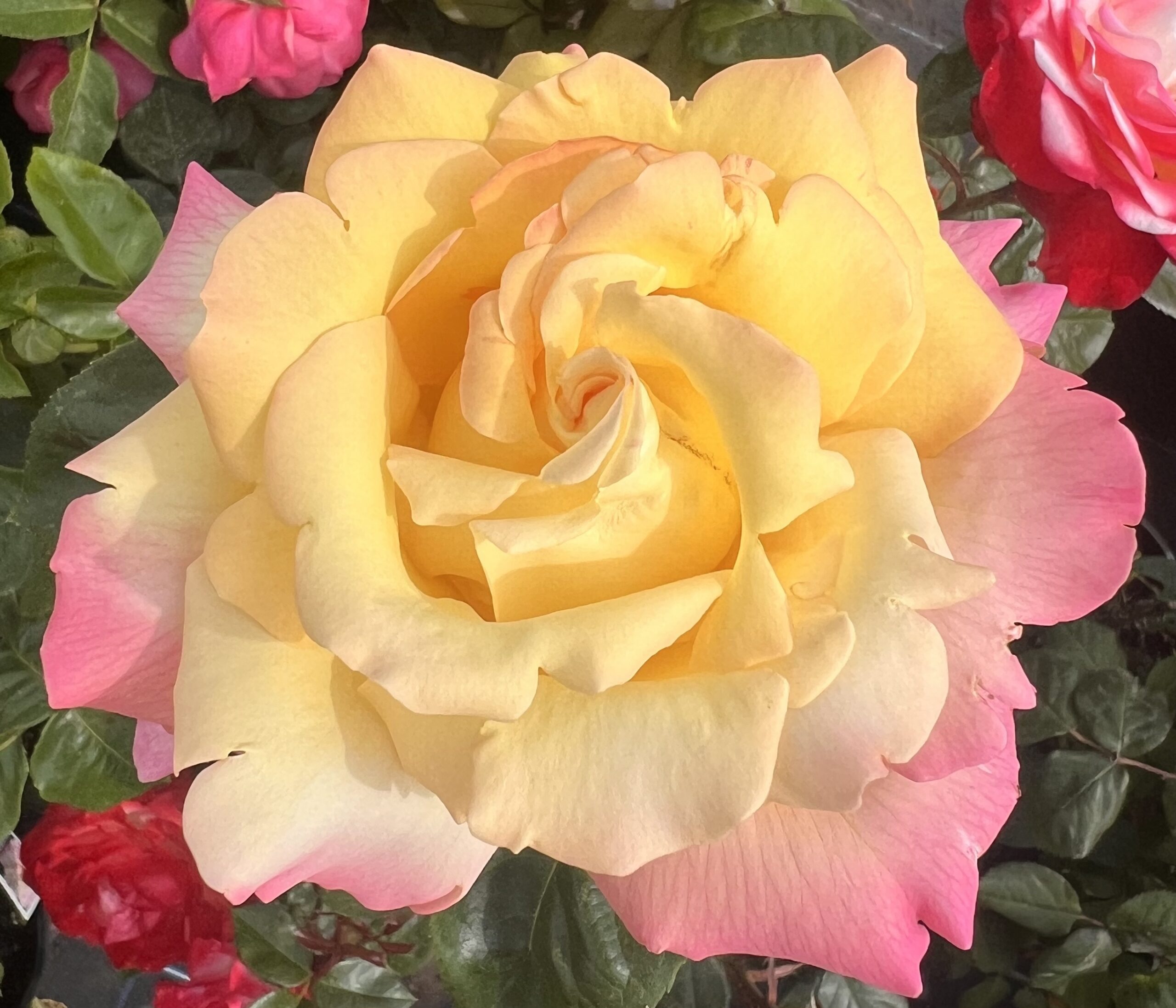 Large yellow blooms with lovely candy pink edges with a sweet scent.