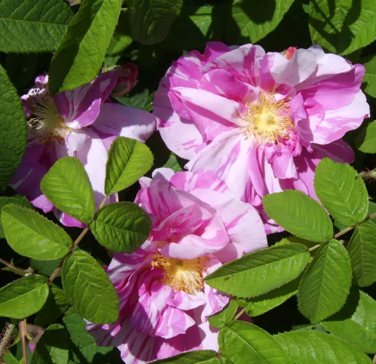 A standout old fashioned variety with gorgeous white and pink striped and blotched petals with golden stamens and a lovely fragrance. The foliage is a lovely rich semi-glossy green. The variety is repeat flowering and is healthy in nature. This old fashioned variety is also award winning having won the RHS Garden Merit Award.